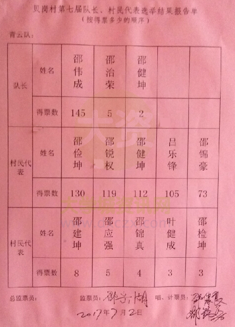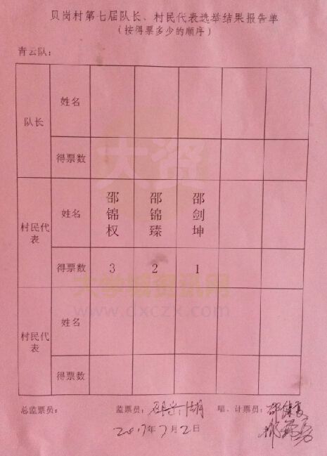 | 贝岗村第七届队长、村民代表选举结果报告单(按得票多少的顺序)--青云队 | ||||||
