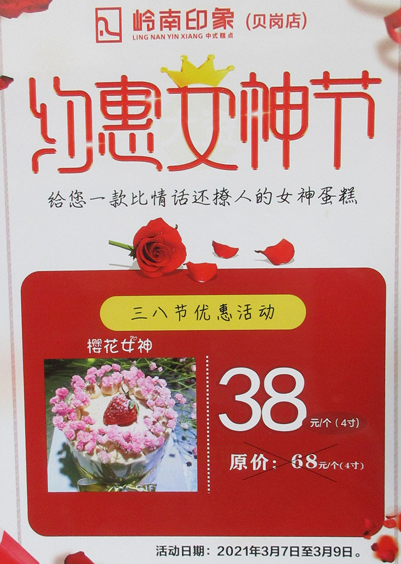 | 贝岗-岭南印象蛋糕店-三八节优惠活动 樱花女神原价68元现价38元 活动日期3.7-3.9 | ||||||