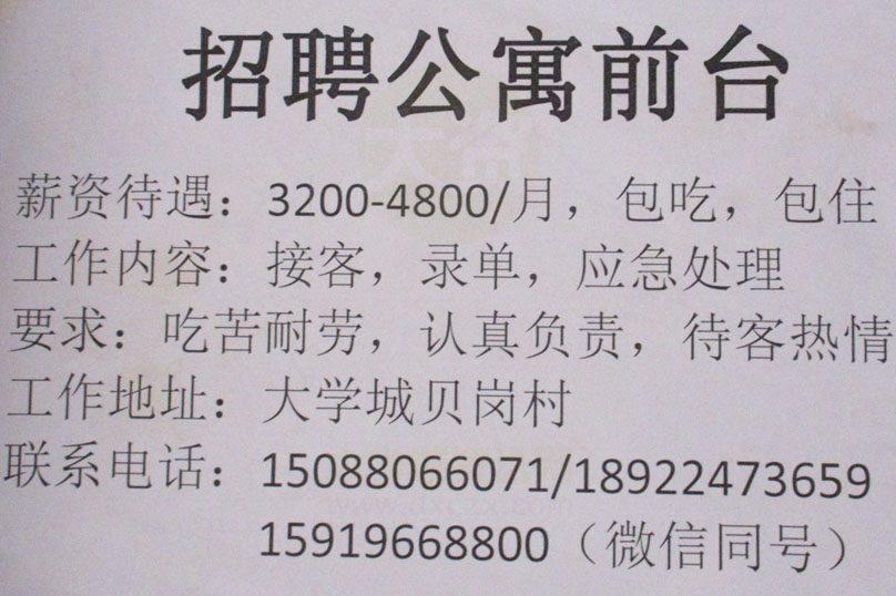 [贝岗村]招聘公寓前台 薪资待遇:3200-4800每月,包吃,包住 工作内容:接客,录单,应急处理 要求:吃苦耐劳,认真负责,待客热情 联系电话:15088066071 |