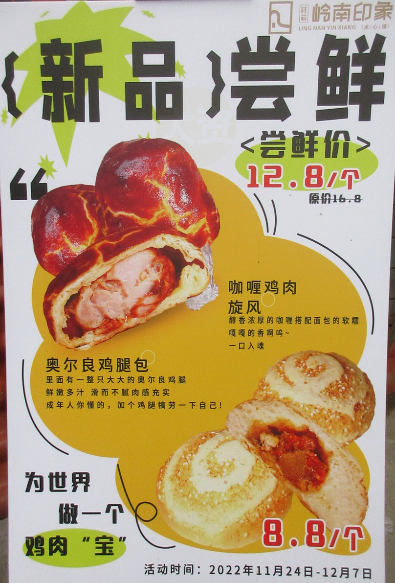 | 贝岗贝南大街西端 岭南印象蛋糕店 新品尝鲜 奥尔良鸡腿包12.8元1个 咖喱鸡肉旋风8.8元1个 活动期2022.11.24-12.07 | ||||||