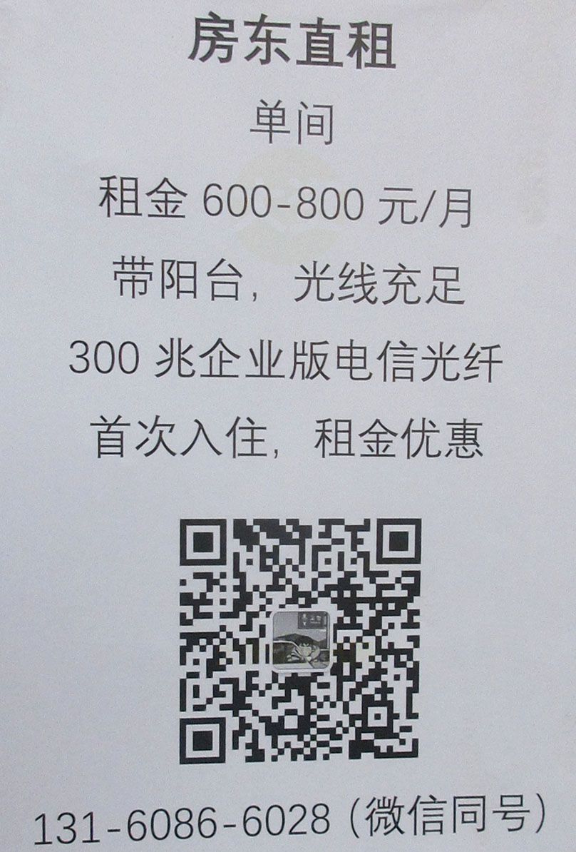 贝岗 房东直租 单间 租金600-800元每月 带阳台,光线充足 300兆企业版电信光纤 首次入住,租金优惠 13160866028(微信同号) |
