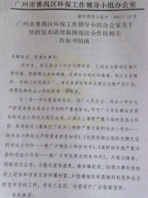 | 广州市番禺区环保工作领导小组办公室关于协助发布清理取缔违法小作坊相关告知书的函 | ||||||