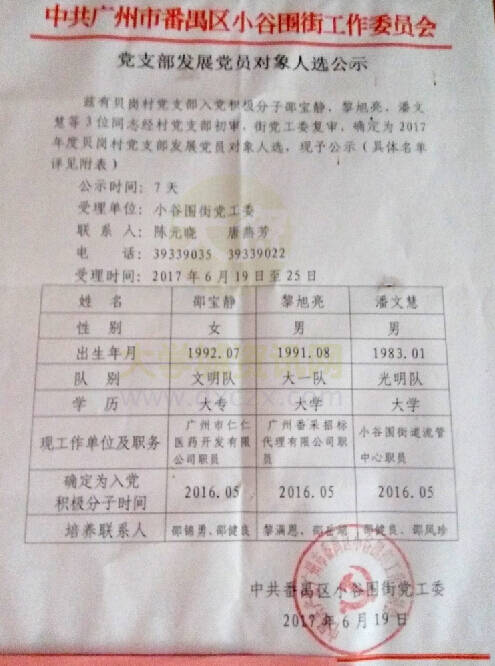 | 中共广州市番禺区小谷围街工作委员会 党支部发展党员对象人选公示 | ||||||