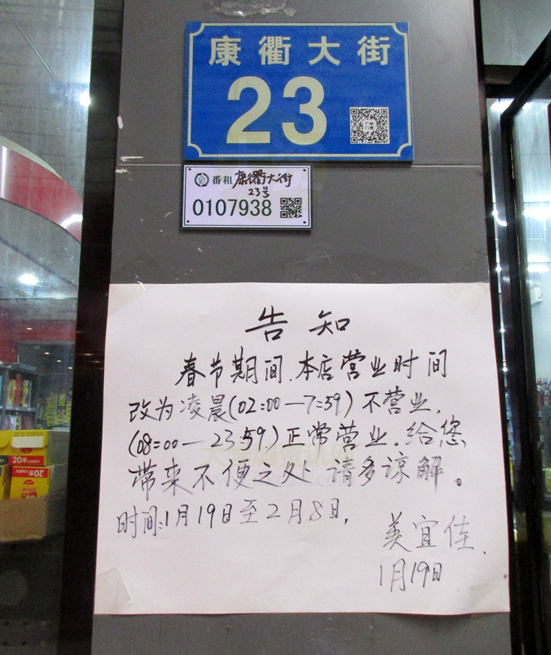 | 贝岗-内街巷-康衢大街23号美宜佳-春节期间营业时间调整周知-凌晨后不营业,白天保持正常 | ||||||