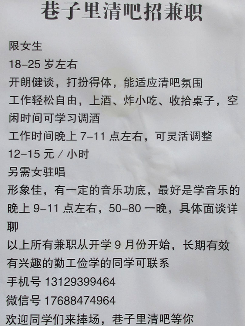 [贝岗村]巷子里清吧招兼职限女生,另需女驻唱 联系13129399464 |
