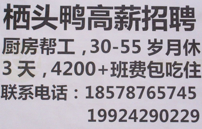 | [贝岗村]栖头鸭高薪招聘 厨房帮工,30-55岁 月休3天,4200+班费包吃住 联系电话:18578765745 19924290229 | ||||||