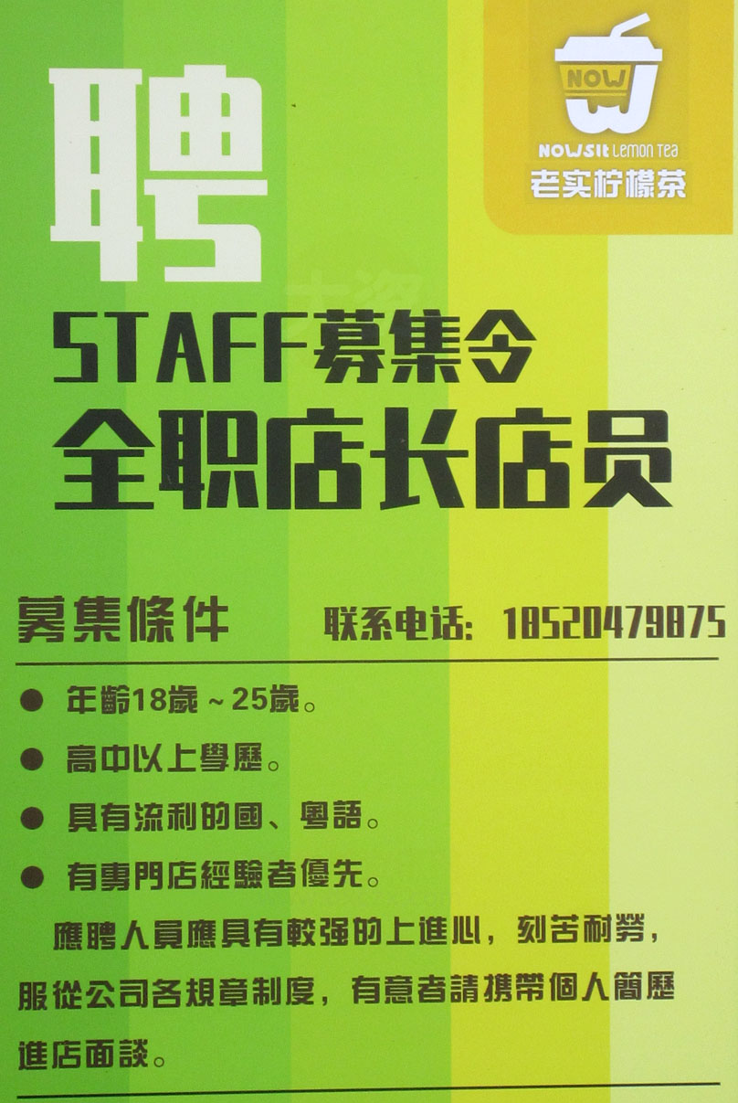 北亭临中环村口转弯处新装店-老实柠檬茶招聘全职店长店员 要求-年龄18-25,高中以上学历,会流利国语粤语,有经验者优先 联系18520479875