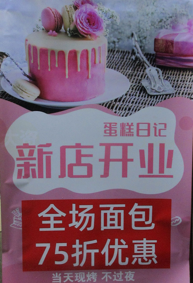 北亭青云大街与北亭东道北交汇处 蛋糕日记蛋糕面包店 已转到隔壁正式算新店开业 全场面包7.5折优惠 隔壁旧铺位也还有开,不知是否算作扩大保留部分一同继续使用