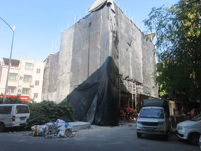 北亭星光下道中&咏川大街二巷路口 这栋还是连在一起两栋整体做旅馆公寓的楼似在围搭棚架是进行装修翻新or改造提升 靠近路口一边较小空间的一楼好像还开了个mini型桌球室,叫晟贸竞技,看着已开业,之前好像是开照相馆的