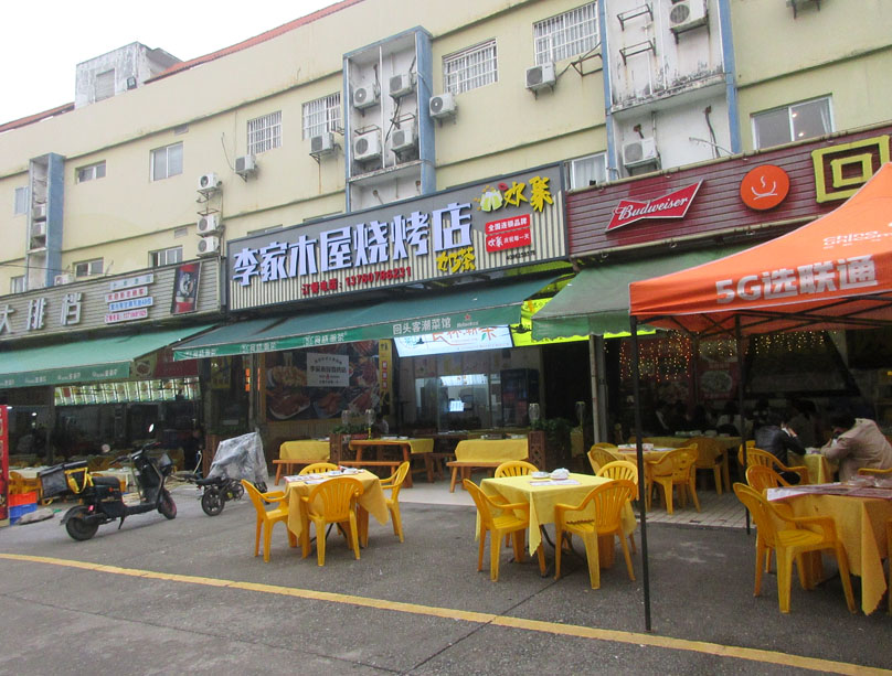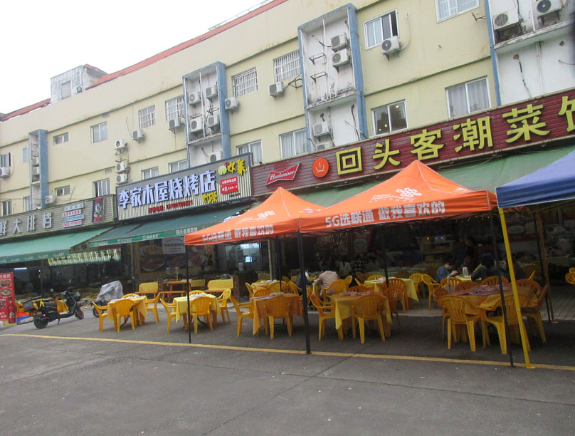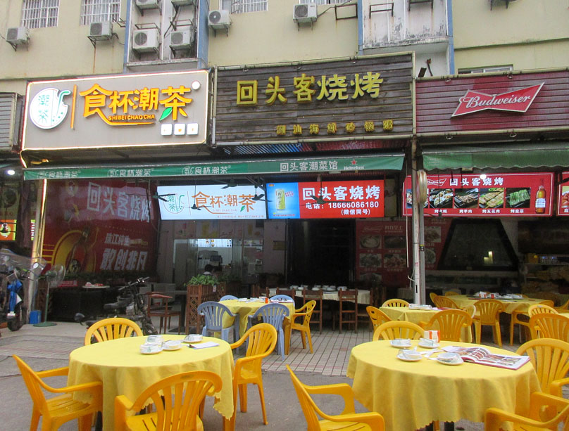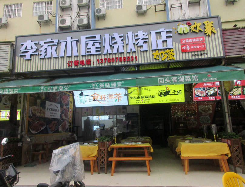 东门广场T8栋北列东 回头客烧烤是改升级or外租让做 李家木屋烧烤了吗 门面招牌把原先的食杯潮茶都覆盖了