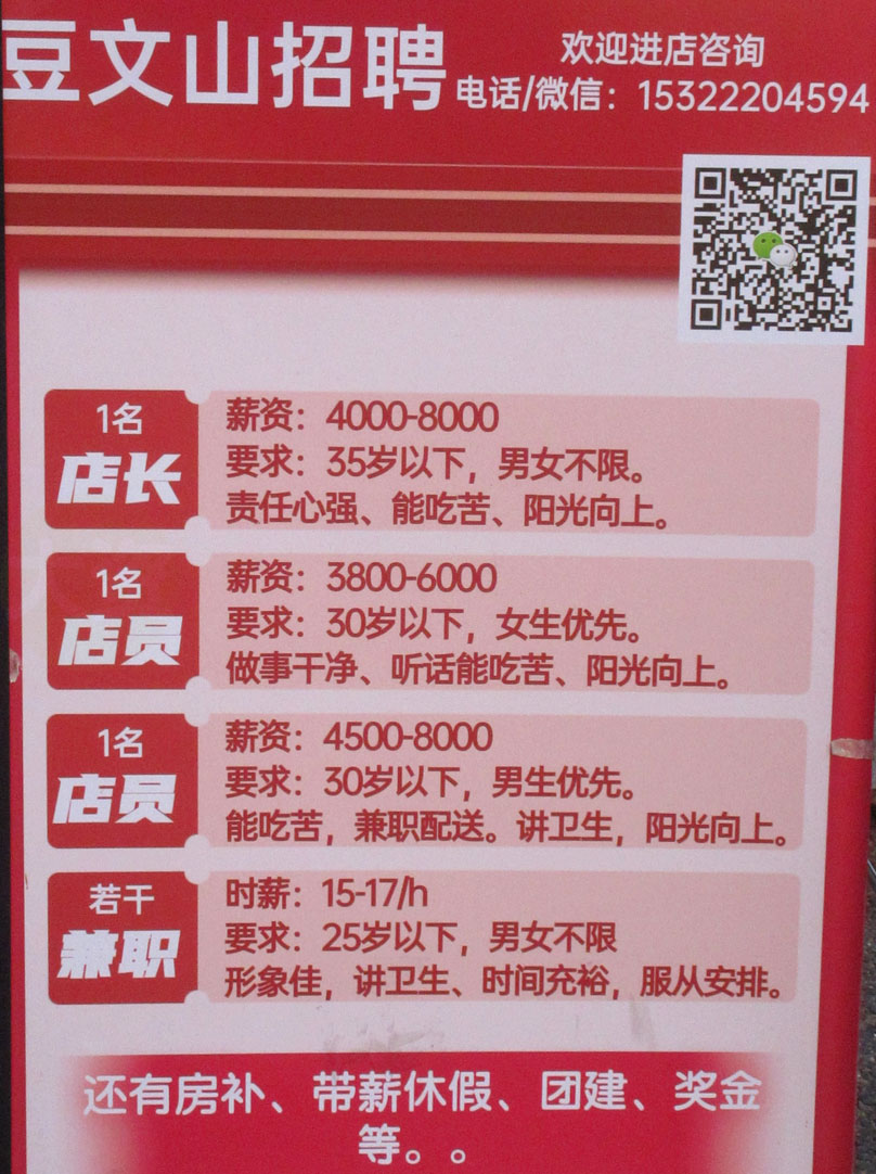 东门广场T8栋西外列中 豆文山招聘 店长1名 店员2名 兼职若干 电话:15322204594