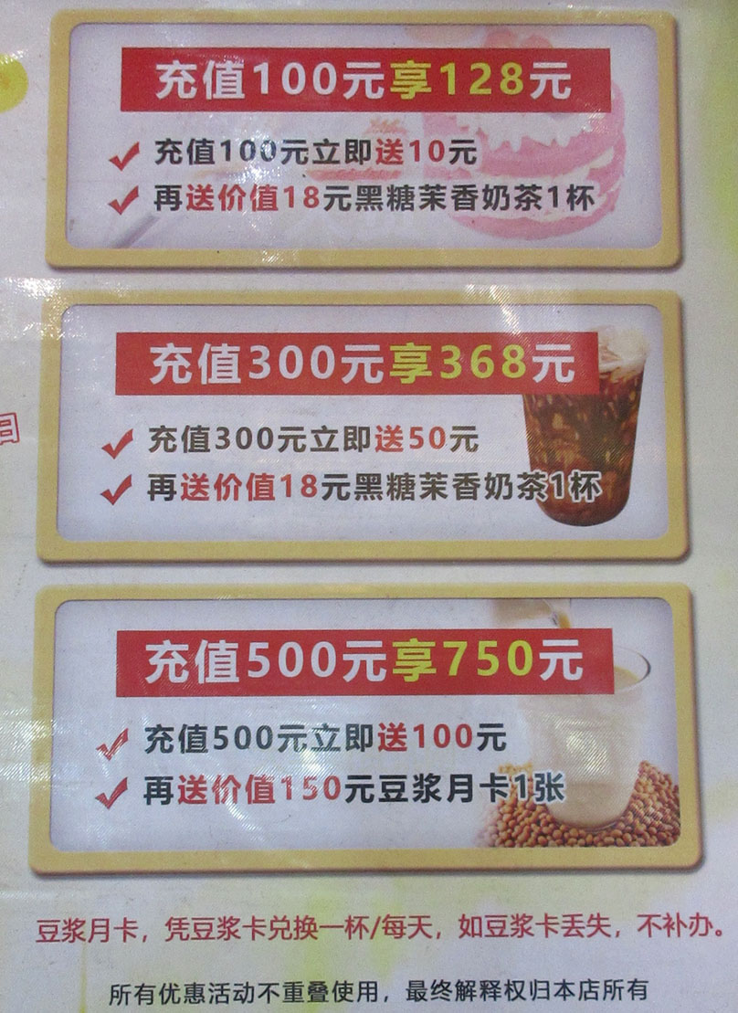 时间11月2日-12月31日 充100享128元,充300享368元(分别金额送10元和50元及18元奶茶1杯) 充500享750元