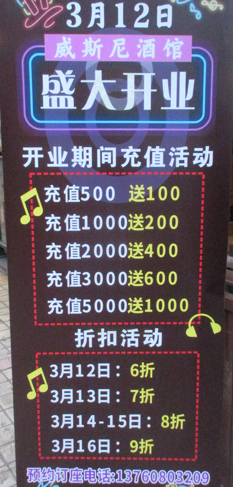 东门广场T7栋南内列中 威斯尼酒馆3月12日盛大开业 消费折扣3.12六折 3.13七折 3.14-15八折 3.16九折 开业期间,充500送100 充1000送200 充2000送400…