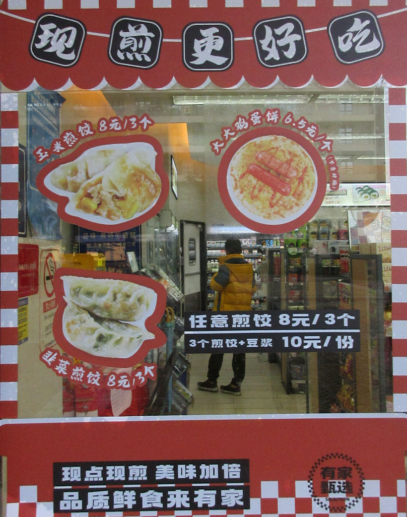 北区-创智园1栋南列东 有家便利店 现煎系列推荐:玉米煎饺8元3个,韭菜煎饺8元3个,大大鸡蛋饼6.5元1个 任意煎饺8元3个,3个煎饺+豆浆=10元1份