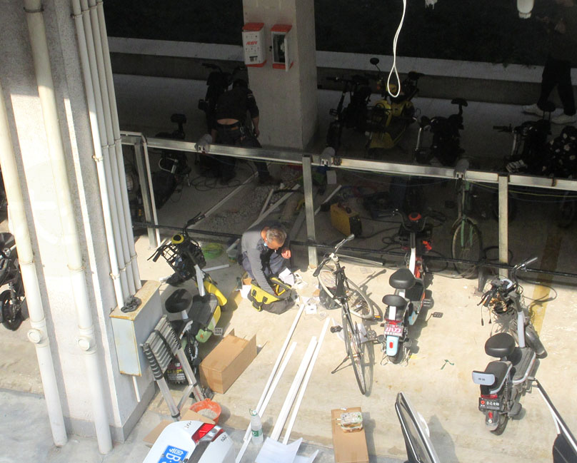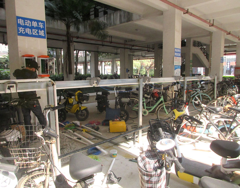 生活区2栋一楼架空层充电区域正在加装多一半(20个)的充电桩插座,位置在靠东侧的原电动车停放位置这边,与原有的20个顺接延长连成一条直线型