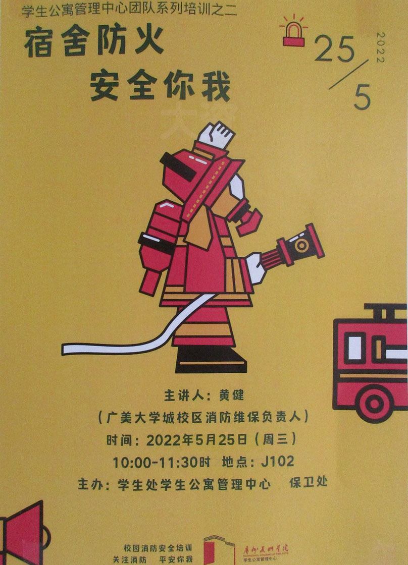 学生公寓管理中心系列培训之“宿舍防火安全你我”主题讲座 2022年5月25日上午 J102 |