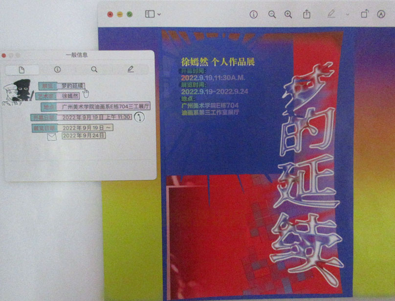 | 梦的延续·徐嫣然个人作品展 展期2022.9.19-9.24 教学区E栋704油三工作室展厅 开幕2022.9.19,11.30A.M | ||||||