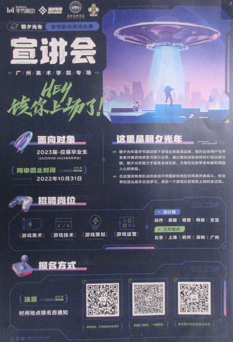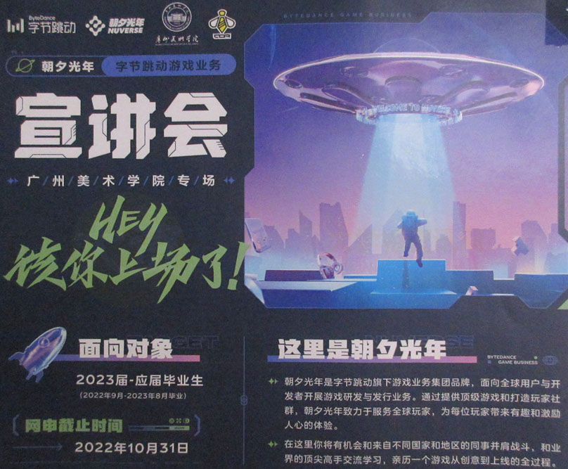 朝夕光年·字节跳动游戏业务 宣讲会 广州美术学院专场 网申截止时间2022年10月31日 线下时间地点报名后通知