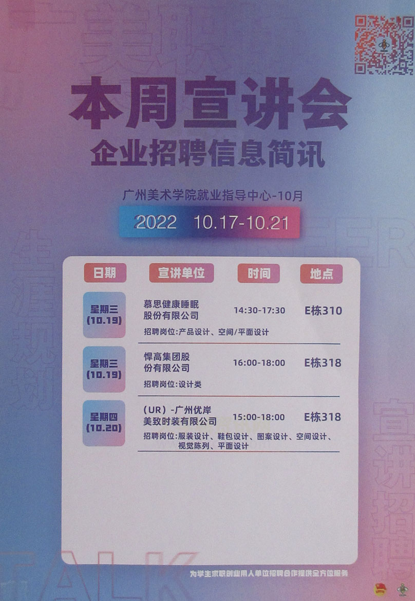 2022.10.17-10.21本周企业招聘宣讲会&讯息简讯 10.19周三 慕思健康睡眠股份有限公司 E栋310 14点30-17点30 |