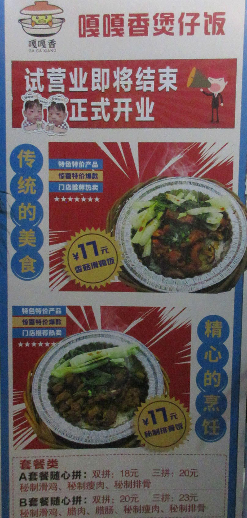 广美饭堂二楼西列北-嘎嘎香煲仔饭试业结束正式开业 特价热卖推荐 香菇滑鸡&秘制排骨均17元 还有套餐类双拼三拼只需18&20&23元