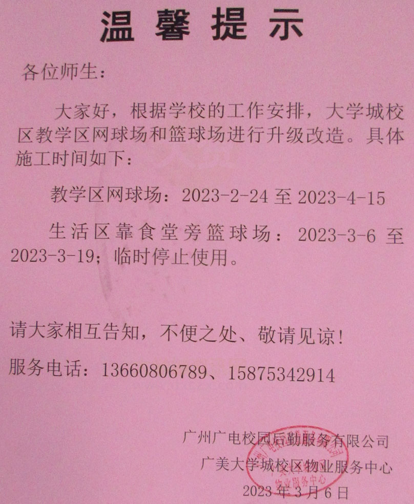 | 广美教学区网球场2023.2.24-4.15和生活区西篮球场2023.3.6-3.19升级改造施工 | ||||||