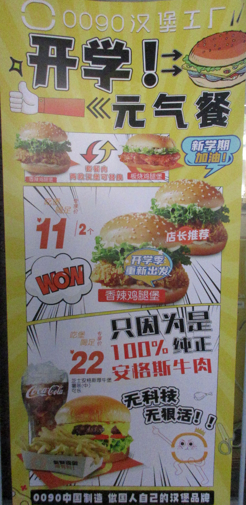 | 广美饭堂一楼东北角楼梯旁 0090汉堡工厂 开学元气餐 香辣鸡腿堡11元2个 芝士安格斯厚牛堡+薯条+可乐共22元 | ||||||