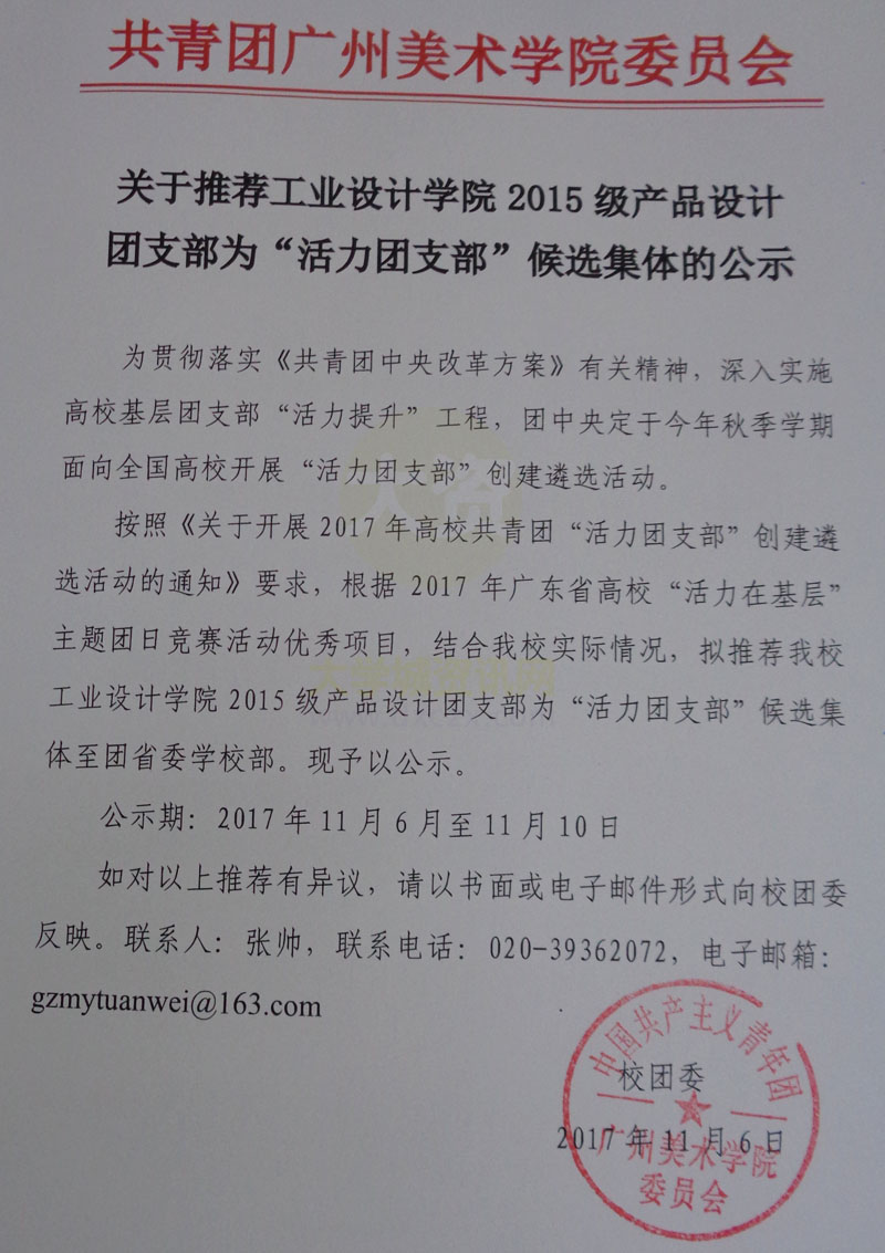 | 关于推荐工业设计学院2015级产品设计团支部为“活力团支部”候选集体的公示 | ||||||