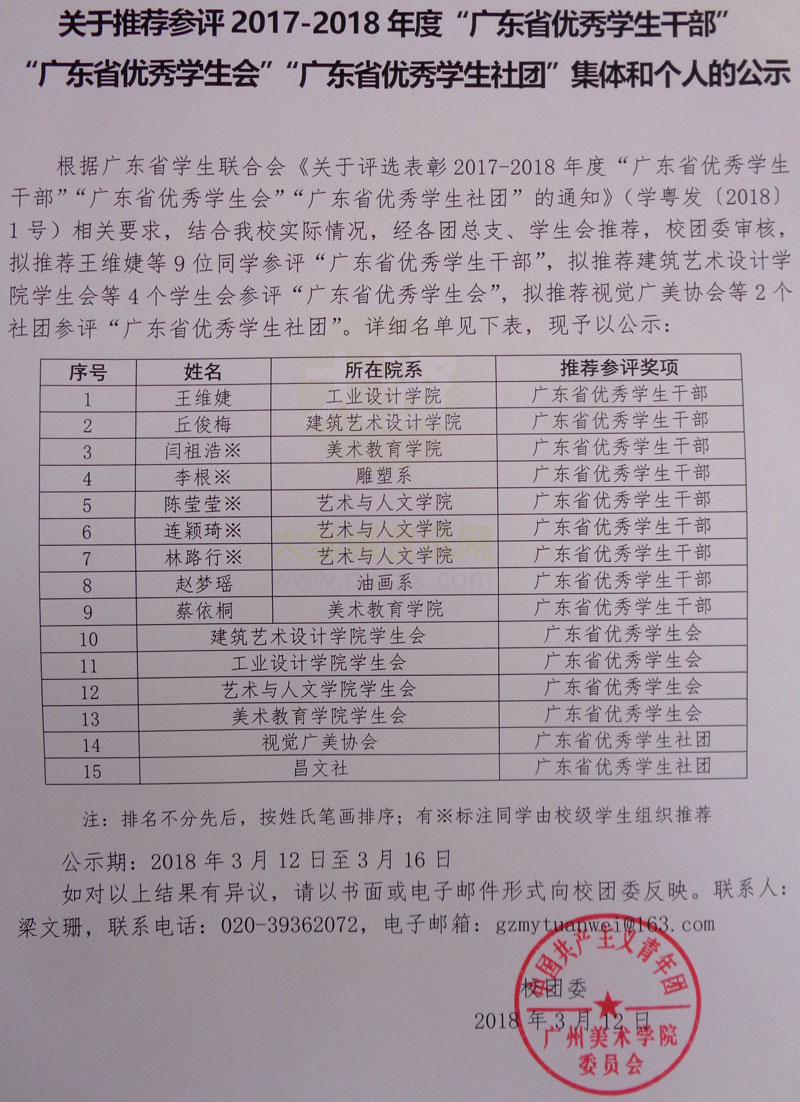 | 关于推荐参评2017-2018年度“广东省优秀学生干部/学生会/学生社团”的公示 | ||||||