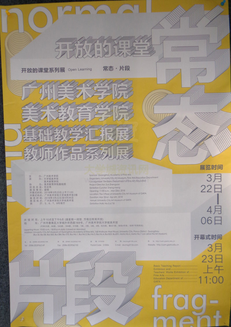 【开放的课堂系列展 常态·片段】 广州美术学院 美术教育学院 基础教学汇报展 教师作品系列展 开幕式时间:2018年3月23日上午11:00 开幕式地点:大学城广美美术馆3楼 展览地点:美术馆5、6、7、8号展厅 展览时间:3月22日-4月06日 开馆时间:上午10点至下午6点(封周一闭馆) |