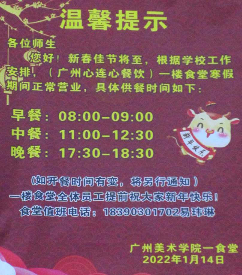 饭堂一楼寒假期间正常营业 早中晚供餐时间详见