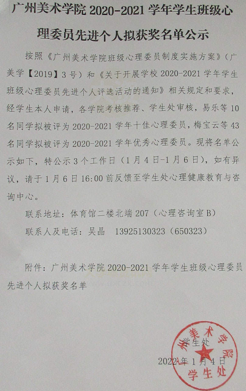 广美2020-2021学年学生班级心理委员先进个人拟获奖名单公示
