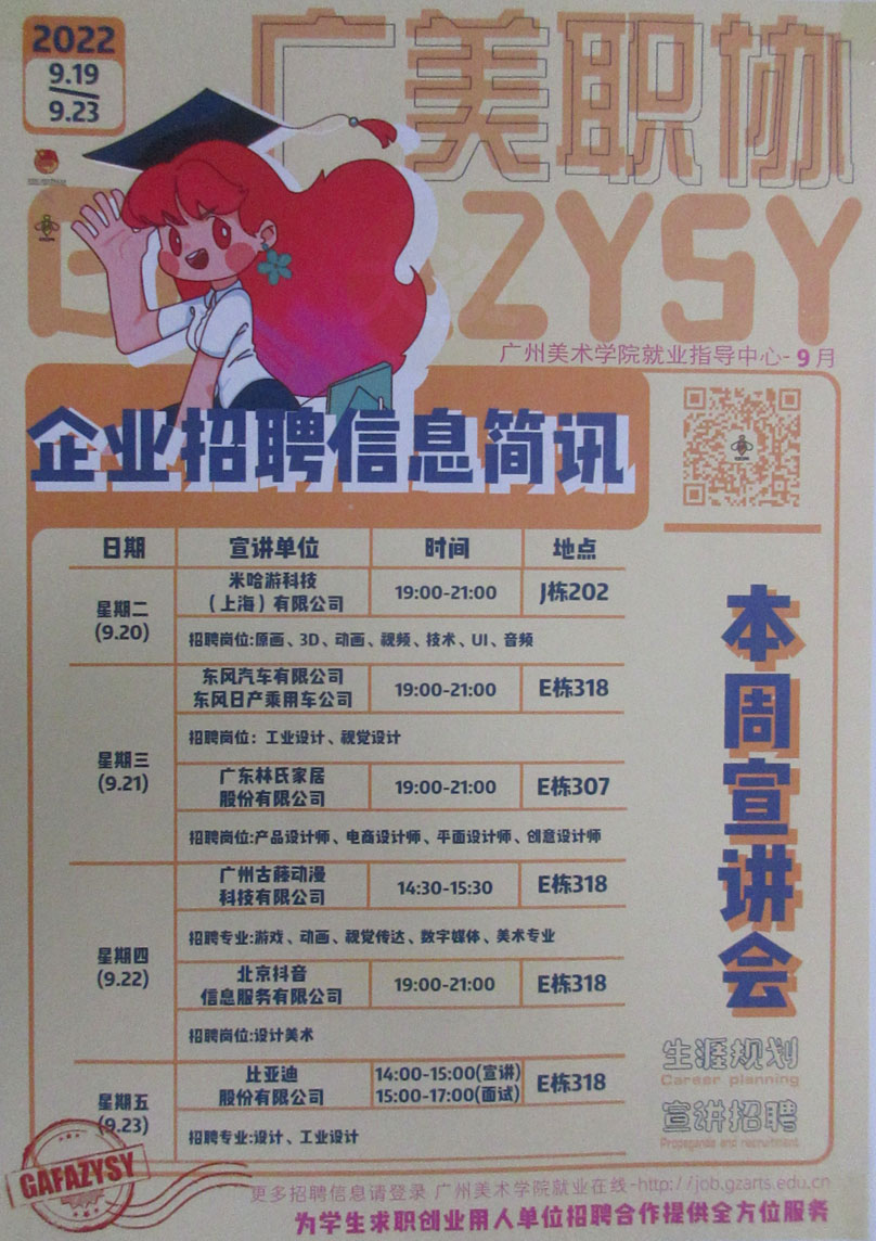 广美职协·企业招聘信息简讯 9月份第三周宣讲会 9.20周二 米哈游科技(上海)有限公司19:00-21:00 J栋202 9.21周三 东风汽车&东风日产乘用车 19:00-21:00 E栋318 9.21周三 广东林氏家居股份有限公司 19:00-21:00 E栋307 9.22周四 广州古藤动漫科技有限公司 14:30-15:30 E栋318 9.22周四 北京抖音信息服务有限公司 19:00-21:00 E栋318 9.23周五 比亚迪股份有限公司 14:00-15:00(宣讲) 15:00-17:00(面试) E栋318 |