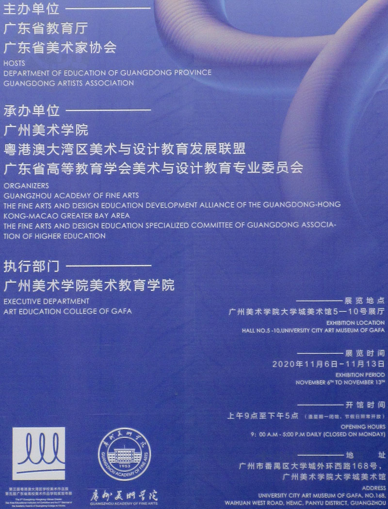 展览时间:2020年11月06日-11月13日 展览地点:广州美术学院大学城美术馆5、6、7、8、9、10号展厅 开馆时间:上午9点至下午5点(逢周一闭馆,节假日照常开放)