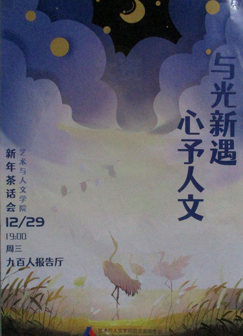 与光新遇心予人文 艺术与人文学院新年茶话会 12.29周三晚19点 900人报告厅 |
