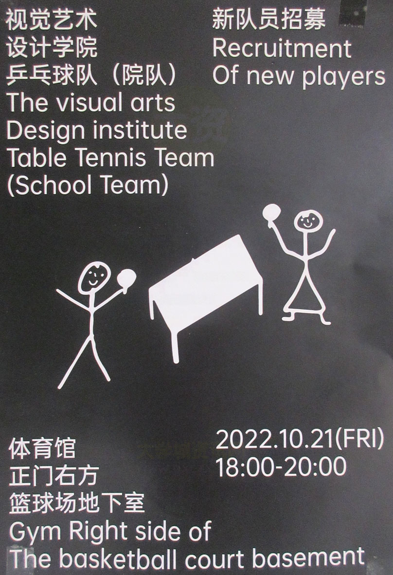 视觉学院乒乓球队2022新队员招募 2022.10.21周五 18点-20点 生活区饭堂北侧负一层乒乓球场 |