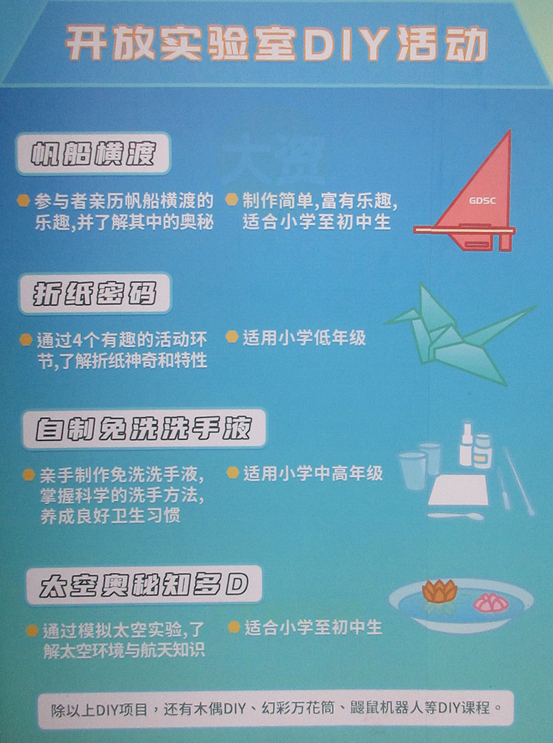 | 广东科学中心·开放实验室DIY活动-帆船横渡 折纸密码 自制免洗洗手液 太空奥秘知多D | ||||||