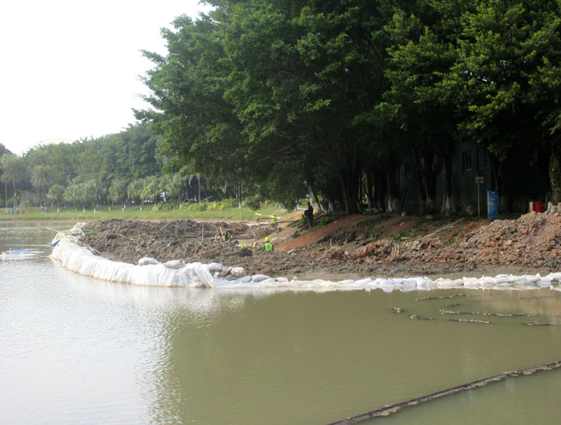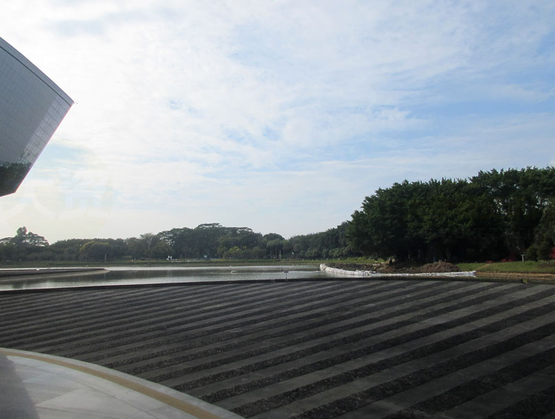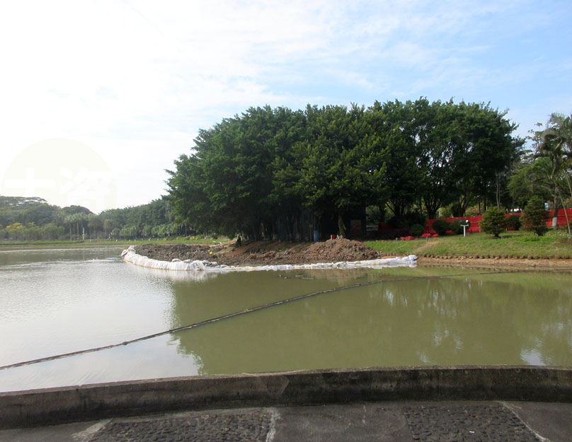 | 科学中心生态湖北部沿岸中位约 正在围堰修筑一个伸出湖面的景观步行桥 | ||||||