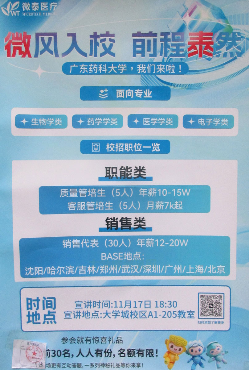 广药-微泰医疗2024校招宣讲会 11月17日周五傍晚18点30 教A1-205 职位有职能类和销售类 |