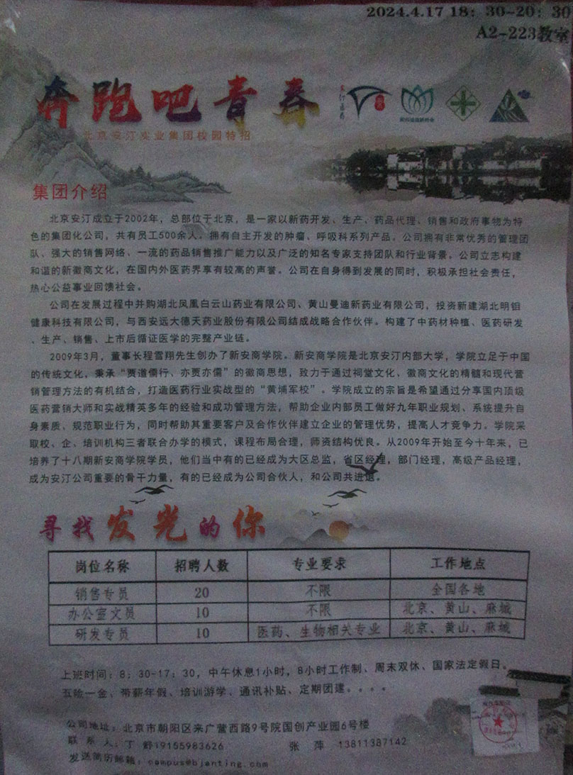 | 广药-北京安汀实业集团校园招聘 2024.04.17傍晚18点30-20点30 教A2-223 招聘销售办公研发等 | ||||||
