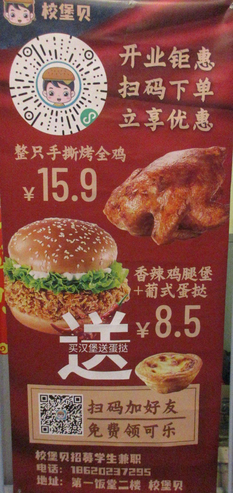 广药一饭二楼 校堡贝 开业钜惠,扫码下单,立享优惠 扫码加好友免费送可乐 招募学生兼职 |
