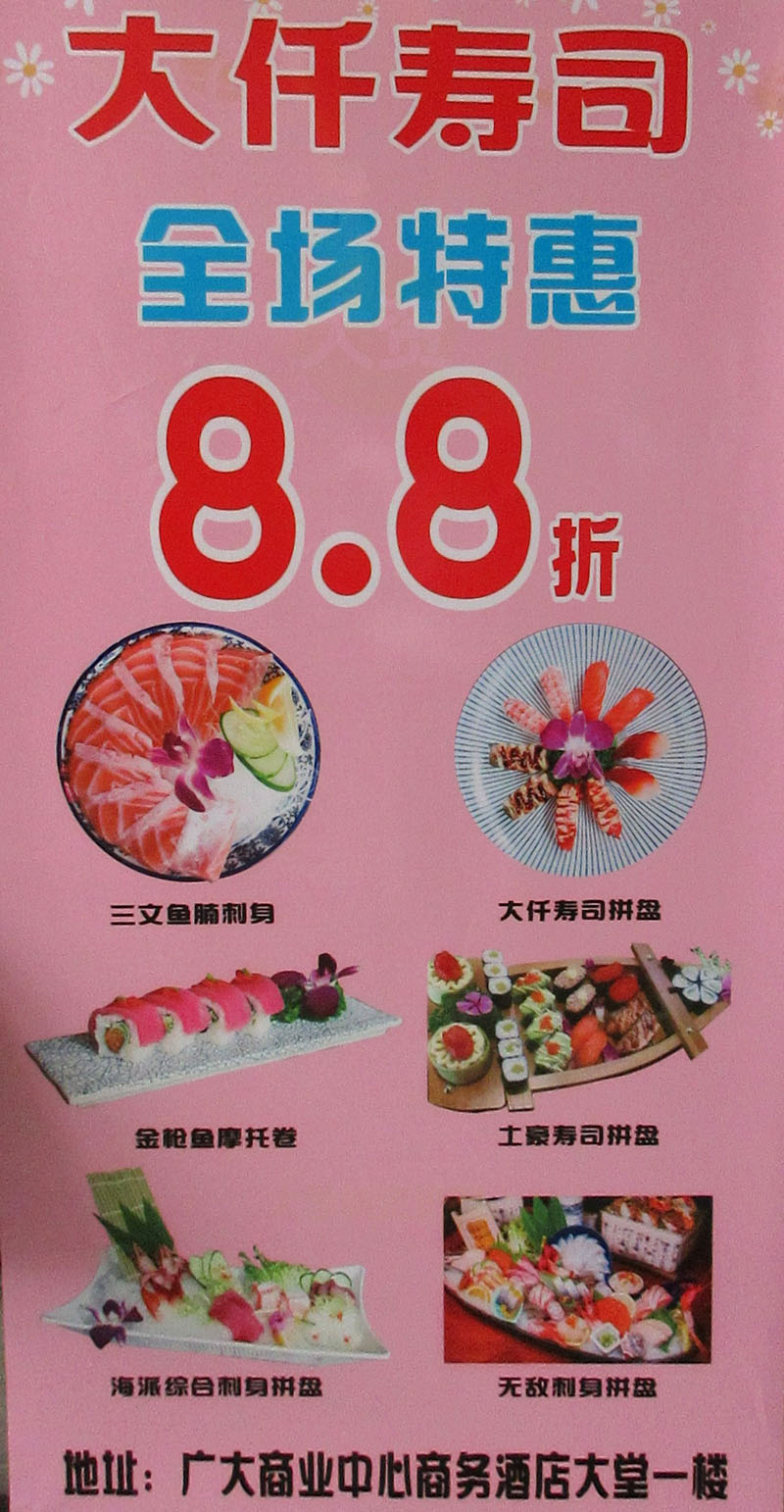 | A区酒店大堂北侧-大仟寿司 全场特惠8.8折 | ||||||