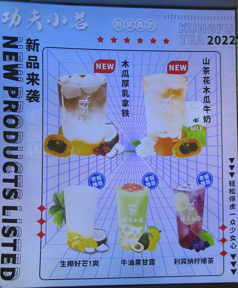 | C区美食中心正门入口直对 功夫小茗 新品来袭 木瓜厚乳拿铁 山茶花木瓜牛奶 生椰好忙 牛油果甘露 利宾纳柠檬茶 | ||||||