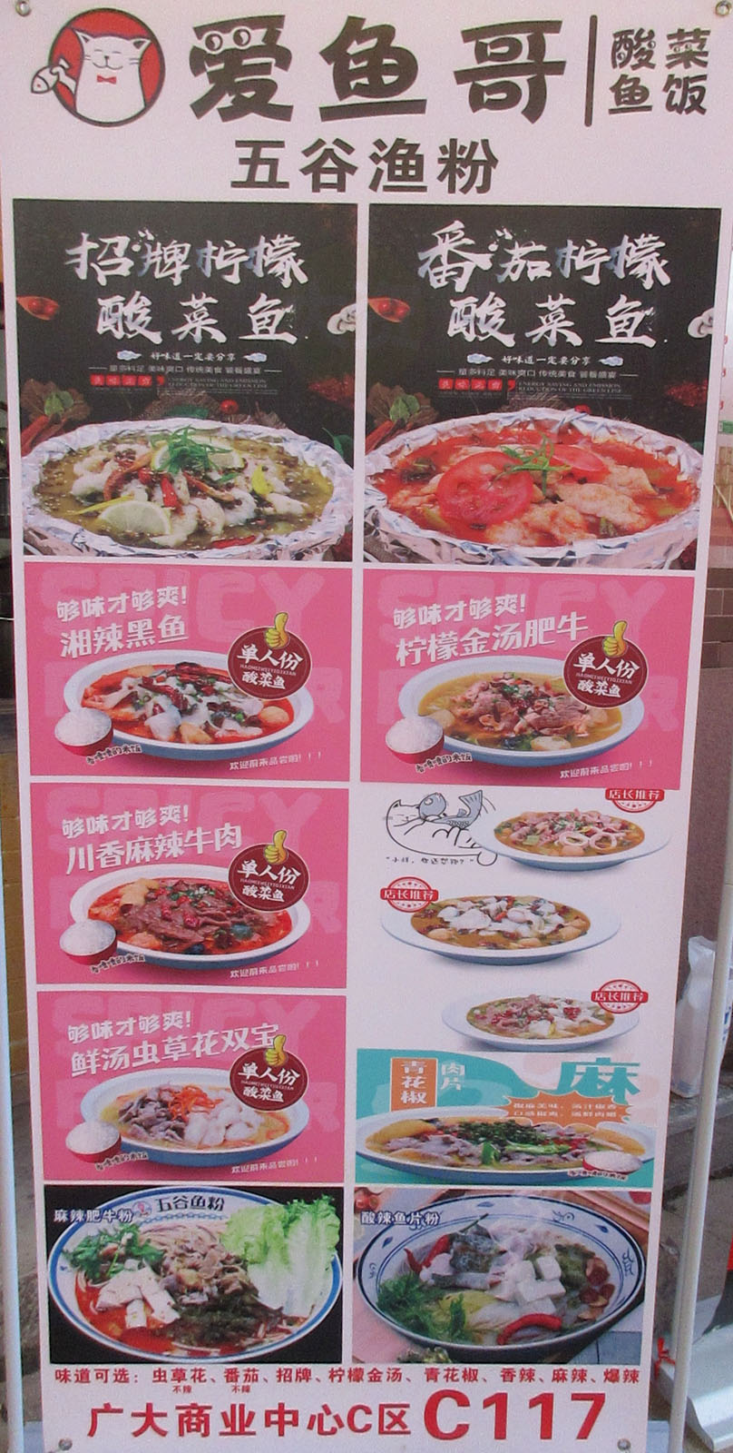 | 广大商中C区一楼美食中心内东区东南角 爱鱼哥酸菜鱼饭 招牌菜式推荐:招牌柠檬酸菜鱼,番茄柠檬酸菜鱼,湘辣黑鱼,柠檬金汤肥牛,川香麻辣牛肉,鲜汤虫草花双宝 | ||||||