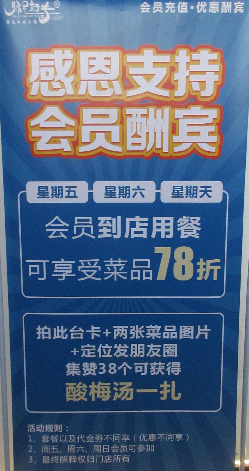 广大商中C区二楼东南角楼梯上 师兄好牛 会员充值,优惠酬宾 周五周六周日-会员到店用餐可享菜品7.8折 拍此台卡+两张菜品图片+定位发朋友圈集赞38个可获酸梅汤一扎