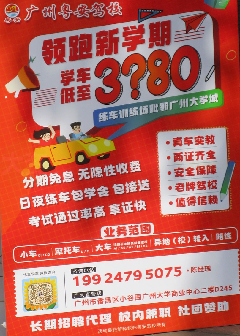 | 广大商中D区二楼东廊道中约 粤安驾校 新学期学车低至3?80元 练车训练场毗邻大学城 分期免息 无隐性收费 日夜练车包学会 包接送 | ||||||