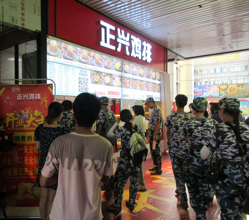 | 美食中心南门廊道外新开一家正兴鸡排店,前三天均有打折优惠,今天是第二天了,近饭点时间,看到不少军训服 | ||||||