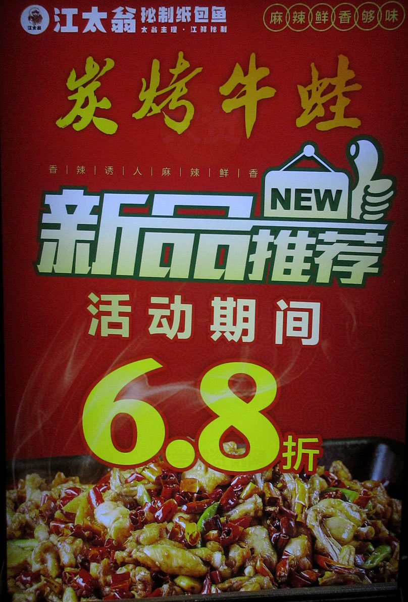 | 新天地东街西列南 江太翁秘制纸包鱼 新品推荐 炭烤牛蛙 活动期间 6.8折 | ||||||
