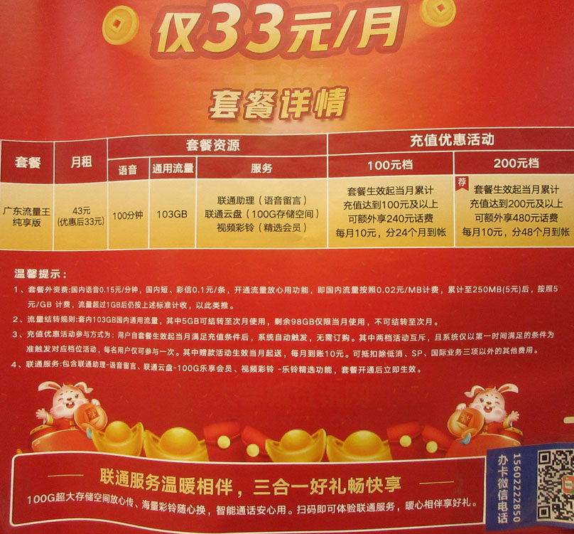 | 商中中庭广场 联通流量套餐推广摊位 校园卡领取处 100G超大流量 充200送480元 仅33元每月 | ||||||