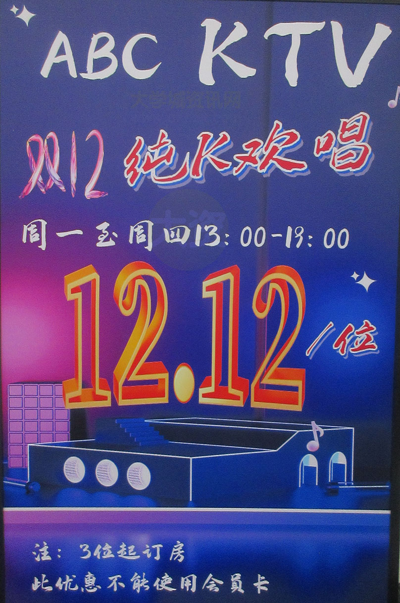 广大商中C区三楼 ABC KTV 双12纯K欢唱 周一至周四13点-19点 12.12元每位 3位起订房