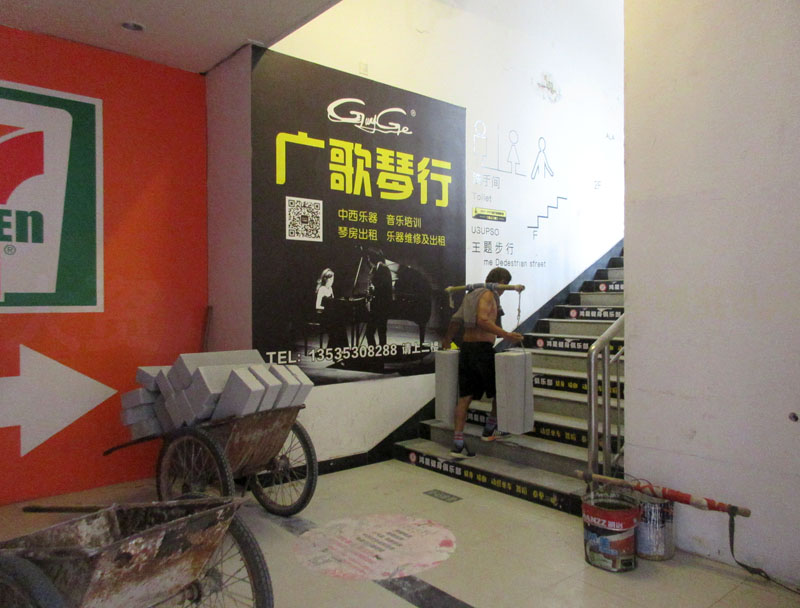 到了楼梯口,还要人力挑担式上三楼,真是不容易啊,建筑工干的都是苦力活啊,不过工钱应该不低吧